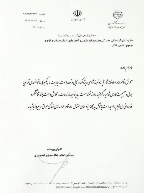 به گزارش خبرنگار پیام طبیعت جنوب کرمان دکتر کامران پورمقدم به سبب اقدامات شاخص و چشمگیر اداره کل منابع طبیعی و آبخیزداری جنوب کرمان از زحمات و تلاش دکتر محمدحسن کردستانی مدیرکل منابع طبیعی و آبخیزداری جنوب کرمان قدردانی کرد.