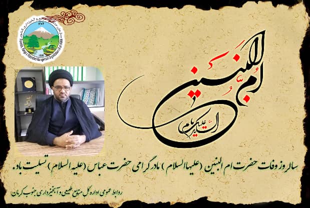 پیام حجت الاسلام والمسلمین سید محمدحسینی زاده مسئول حوزه نمایندگی ولی فقیه اداره کل منابع طبیعی و آبخیزداری جنوب کرمان، به مناسبت سالروز وفات حضرت ام البنین (س) و روز تکریم مادران و همسران شهدا
