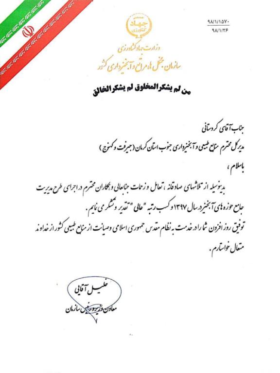 لازم به ذکر است جناب آقای مهندس آقایی معاون محترم وزیر و رئیس سازمان جنگلها، مراتع و آبخیزداری کشور در حضور معاونین و مدیران ستادی سازمان و نیز مدیران کل منابع طبیعی و آبخیزداری سراسر کشور از دکتر کردستانی مدیرکل منابع طبیعی و آبخیزداری جنوب کرمان و همکاران وی تقدیر نمودند .