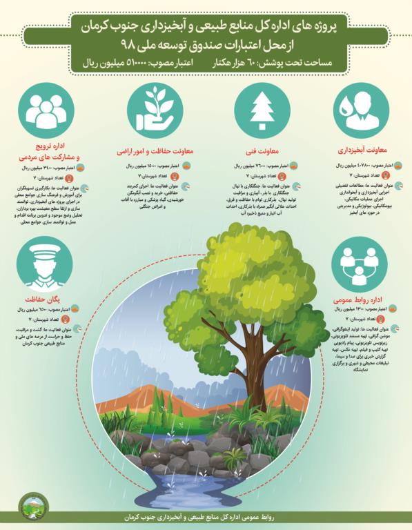 سرپرست اداره کل منابع طبیعی جنوب کرمان در مورد پروژههای اداره کل منابع طبیعی و آبخیزداری جنوب کرمان که اعتباراتشان را از صندوق توسعه ملی دریافت می کنند می گوید: «این اداره کل پروژه های خود را در ۶ سرفصل دنبال می کند، آبخیزداری ، حفاظت از اراضی، ترویج ومشارکت های مردمی، تشکیل یگان حفاظتی ،معاونت فنی و روابط عمومی، سرفصلهایی هستند که پروژه های منابع طبیعی جنوب کرمان در آن اجرایی می شوند. این پروژه ها برای حفاظت از عرصه منابع طبیعی وثروت ملی است.»